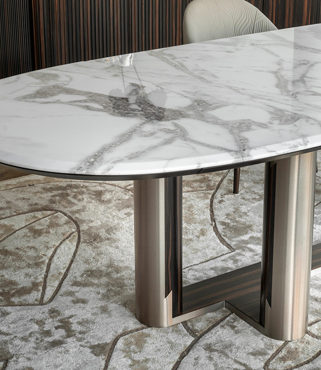 Top in high gloss finish Namibian Oyster marble. Base in combination of satined Makassar Ebony veneer and satined galvanized titanium finish stainless steel.